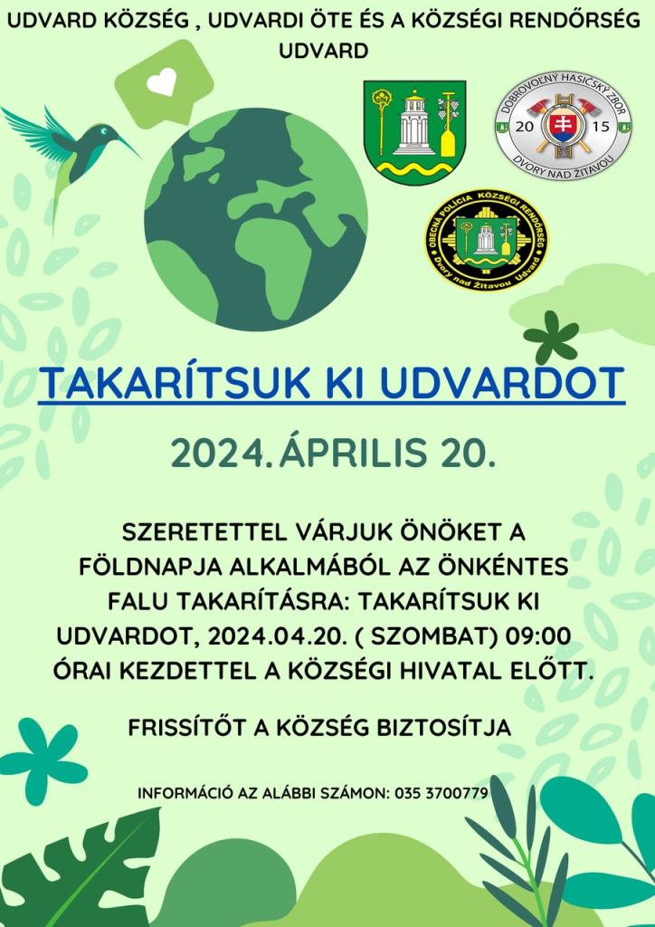 Udvard község az önkéntes tűzoltóinknak köszönhetően csatlakozott az Takarítsuk ki Udvardot című felhíváshoz. A rendezvényt a Föld napja alkalmából szerveztük. Úgy érzem, hogy manapság, amikor a legtöbb ember szeretné rendben tartani a házát és az udvarát, nem akarja látni, mi van a kerítésén túl. Annak ellenére, hogy községünkben rendszeresen szelektáljuk és elszállíttatjuk a szemetet, sokan olyan helyre dobják, ahova nem való - a természetbe, ami mindannyiunké. Köszönöm Mgr. Nagy Szilviának az egész rendezvény megszervezését, az önkéntes tűzoltóink, községi rendőreink, a helyi polgári és megelőző szolgálat tagjainak, valamint Horváth Szilvia mérnöknő, illetve Mgr. Vadkerti Magdaléna segítségét, továbbá minden önkéntesnek, aki részt vett a rendezvényen. Önmagunkért és gyermekeinkért tesszük, hogy megmutassuk, hogyan óvjuk a környezetünket. Ilyen módon szeretnénk elérni, hogy megtanuljunk jobban élni.